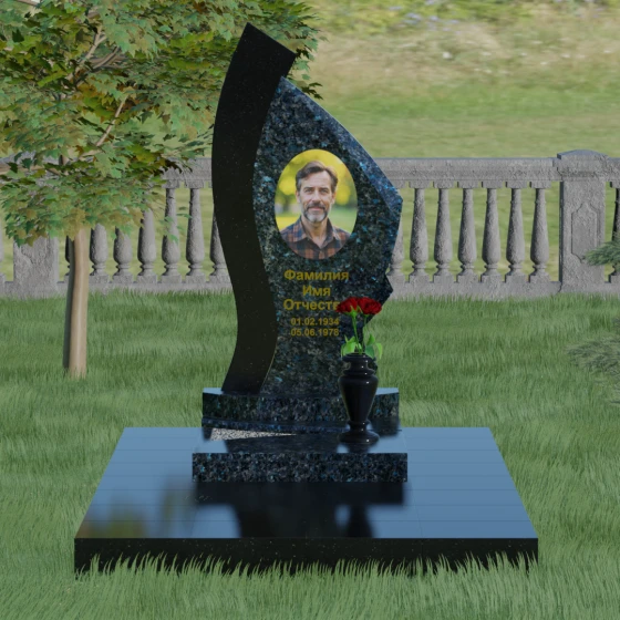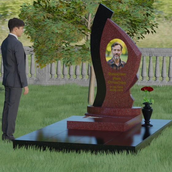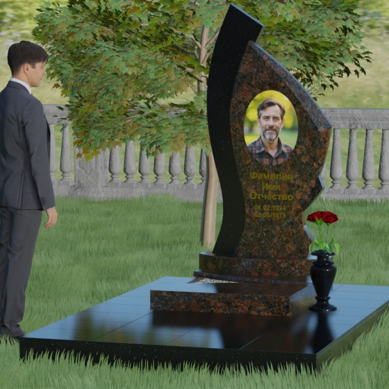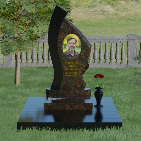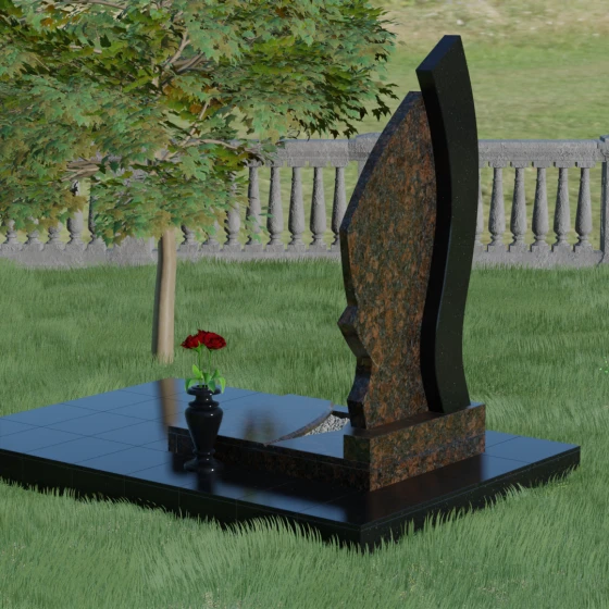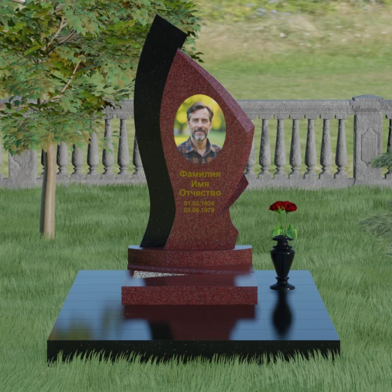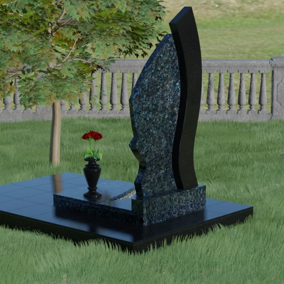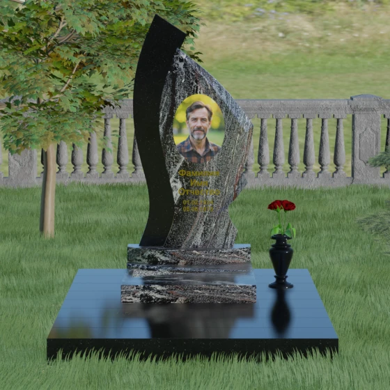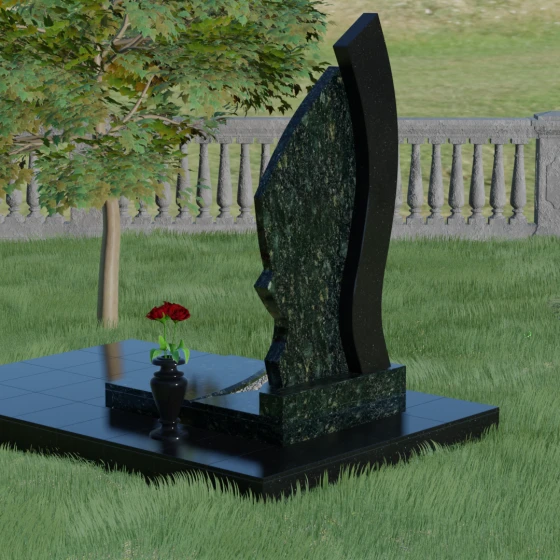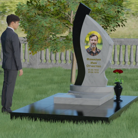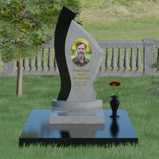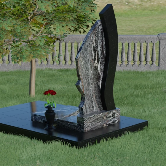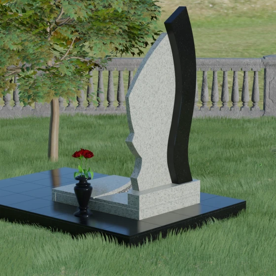 Форма этого памятника глубоко символична. Асимметрия олицетворяет жизненный путь — не всегда ровный, но всегда уникальный. Сочетание двух разных пород камня в одной стеле символизирует неразрывную связь души и тела, земного и вечного. Плавный изгиб верхней кромки напоминает защитное крыло или тихую волну памяти, уносящую печаль, оставляя лишь светлые воспоминания. Этот монумент внушает чувство покоя и защиты, словно оберегая покой ушедшего своей массивной и надежной конструкцией.