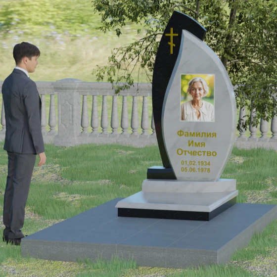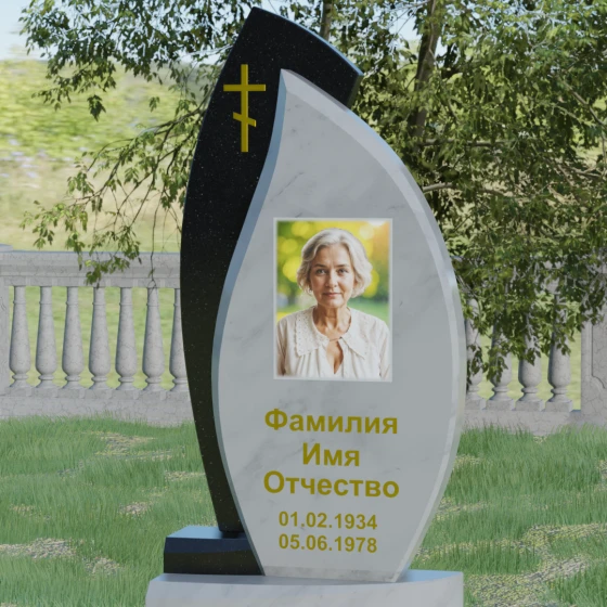 Основой художественного замысла выступает эффектная асимметрия и игра контрастных фактур. Центральная часть надгробия, предназначенная для размещения портрета и памятных надписей, выполнена в форме изящного лепестка или капли из глубокого черного камня. Ее плавные, текучие линии символизируют бесконечность бытия и чистоту души. Оправа, охватывающая центральный элемент с левой стороны, имеет более строгую, динамичную геометрию с выраженным острым углом в верхней части, что создает визуальный эффект защищенности и опоры. Особое внимание уделено деталям: на левом «крыле» композиции лаконично расположился восьмиконечный православный крест, выполненный в технике глубокой гравировки с последующим золочением. Это придает всей конструкции духовную завершенность и благородство.