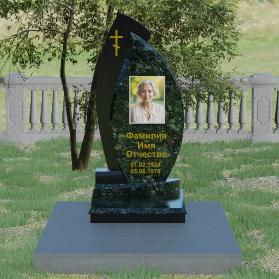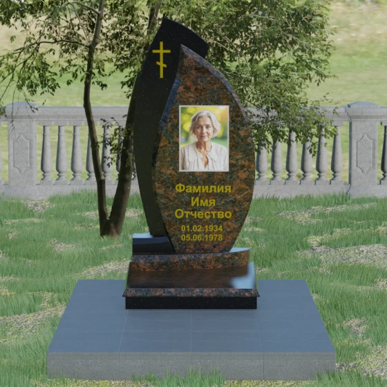 Кому подойдет: Данная модель является универсальным и в то же время глубоко индивидуальным решением. Благодаря мягким изгибам центральной части, она идеально подходит для оформления женских захоронений, воплощая нежность и материнскую любовь. В то же время строгая внешняя рама и возможность исполнения в темных, маскулинных тонах (например, в черном Габбро или зеленом граните Балтик грин) делают этот гранитный монумент достойным выбором для мужчины — отца, мужа или брата. Это памятник для тех, кто ценит современный стиль, надежность и хочет выделить место памяти среди типовых решений за счет уникальной формы и премиального сочетания материалов.