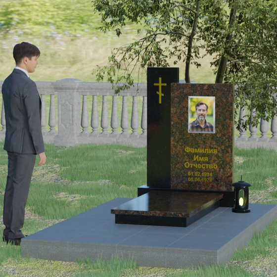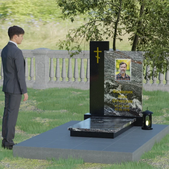 Визуальное решение данного мемориала строится на благородном контрасте двух вертикальных элементов, что позволяет создать глубокий и многогранный художественный образ. Композиция состоит из двух стел разной высоты, установленных внахлест. Более высокая и узкая стела служит духовным стержнем комплекса: на её полированной поверхности закреплен лаконичный православный крест. Его строгие линии и золотистое покрытие подчеркивают святость места и символизируют надежду на вечную жизнь. Широкая основная панель выступает в качестве смыслового центра, где располагается портрет и основные памятные надписи. Использование фотокерамики или портрета на стекле в специальной нише придает образу особую четкость и глубину, гармонируя с зеркальной поверхностью камня.