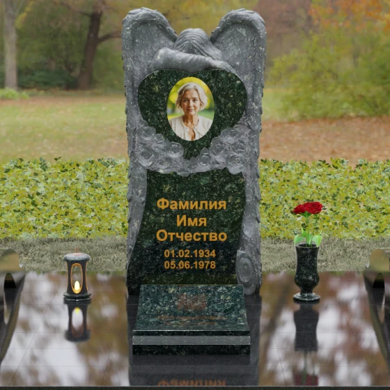Данная мемориальная композиция представляет собой истинное произведение ритуального искусства, где каждый элемент пропитан глубоким символизмом и благородством. Центральным художественным образом выступает величественная фигура скорбящего ангела, чьи массивные крылья бережно, словно в последней попытке защитить, обрамляют стелу в форме сердца. Мастерство камнереза здесь проявляется в искусной игре контрастов: матовая, детально проработанная фактура оперения крыльев и драпировок одежды небесного покровителя противопоставлена зеркально отполированной глади черного гранита. Именно на этой поверхности, лишенной малейших изъянов, свет преломляется наиболее эффектно, создавая ощущение глубины и монументальности.