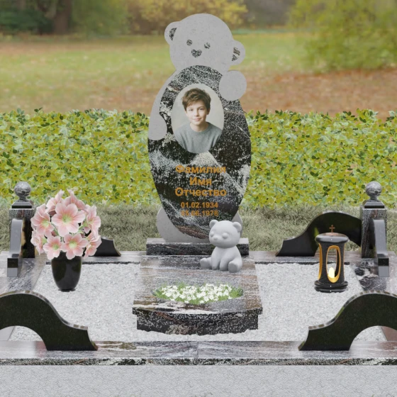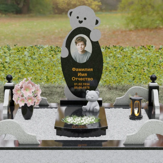 Данная мемориальная композиция представляет собой уникальный образец художественной резьбы по камню, где детская непосредственность встречается с монументальной торжественностью. В центре внимания — трогательный образ медвежонка, который словно оберегает покой ушедшего, заключая его портрет в свои ласковые объятия. Форма стелы лишена острых, агрессивных углов; здесь превалируют плавные, округлые линии, символизирующие бесконечность любви и мягкость воспоминаний. Мастерски выполненный контраст между глубокой зеркальной полировкой темного камня и светлой, матовой фактурой «головы» и «лап» изваяния создает эффект объема и многослойности.
