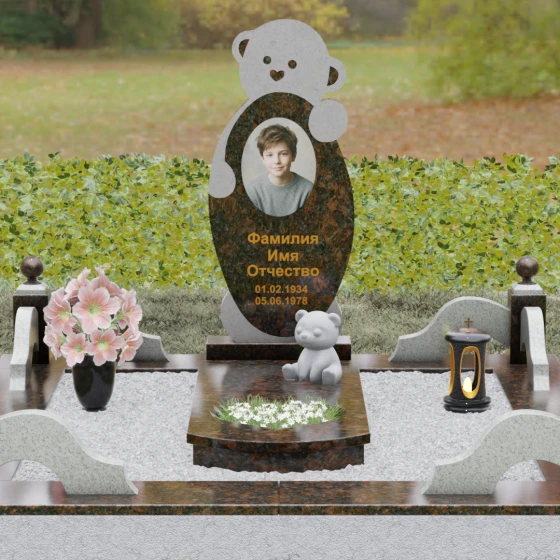 • Скульптурное дополнение: У подножия основной стелы расположена миниатюрная фигурка медвежонка, вырезанная из светлого камня, которая дублирует главный мотив и делает мемориал еще более трогательным.