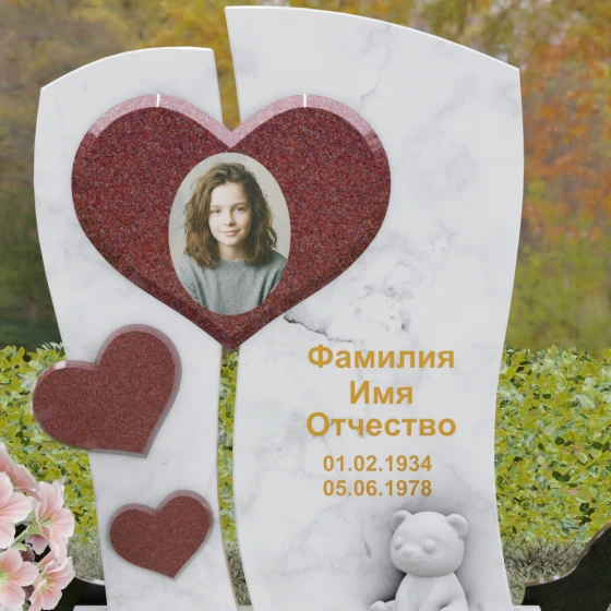 Оформление: Уникальная геометрия этого надгробия сама подсказывает идеальное расположение гравировки. Крупное центральное сердце словно создано для размещения портрета — здесь он будет главным смысловым акцентом, защищенным символом любви. Правую, более широкую часть плиты, рекомендуется использовать для нанесения Фамилии, Имени, Отчества и дат жизни. Здесь же останется достаточно места для проникновенной эпитафии или дополнительного декоративного элемента, например, небольшой виньетки или креста.
