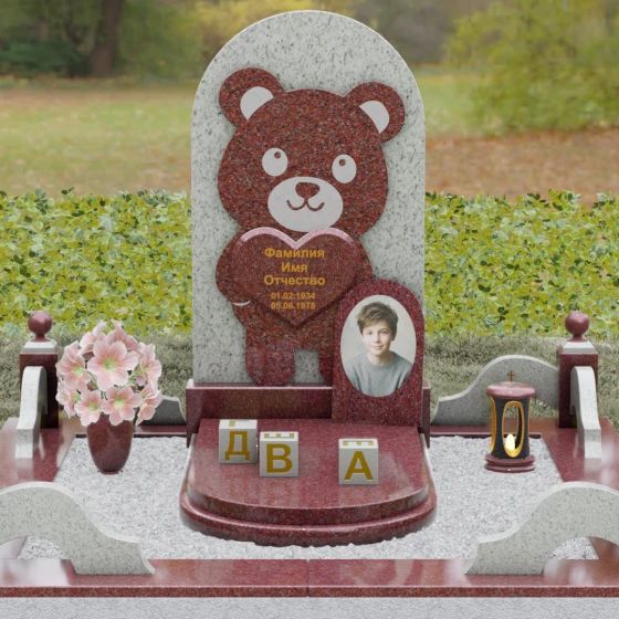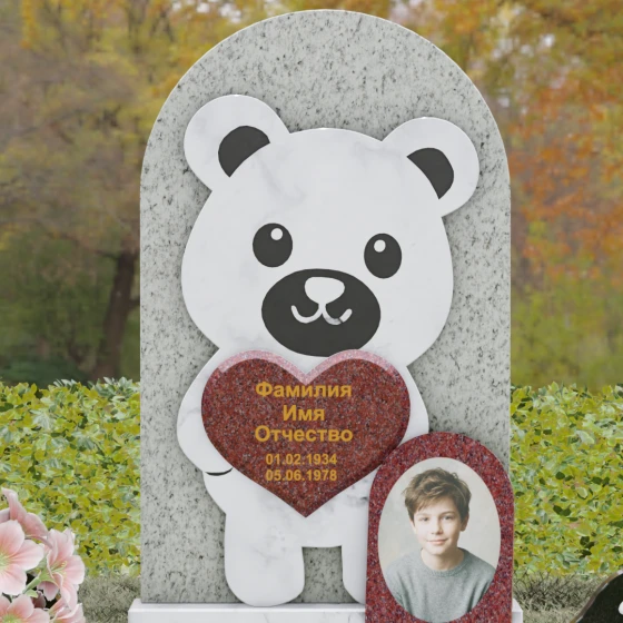 Данная мемориальная композиция представляет собой уникальное сочетание трогательной нежности и величественной непоколебимости камня. В центре художественного замысла лежит глубокий символизм: фигура медвежонка, бережно держащего в лапах сердце, олицетворяет чистоту, бесконечную родительскую любовь и защиту, которую близкие стремятся подарить даже после ухода дорогого человека. Это надгробие из натурального камня выполнено в технике художественного комбинирования различных пород, что создает потрясающий визуальный объем. Массивная светлая стела с полукруглым завершением служит идеальным фоном для темного силуэта, вырезанного с ювелирной точностью. Игра контрастов между зеркальной полировкой черного камня и благородной текстурой светлого гранита подчеркивает каждую деталь: от доброго взгляда лесного покровителя до мягких контуров его фигуры.