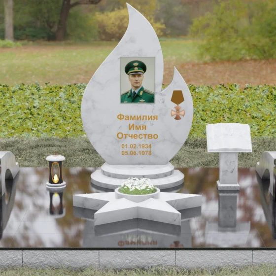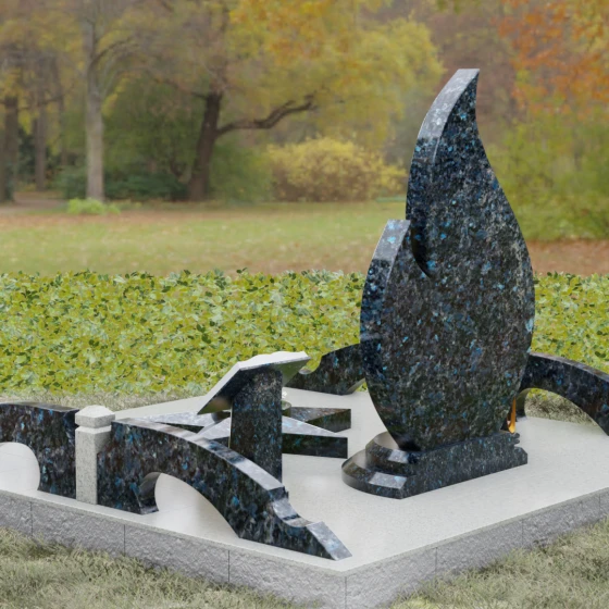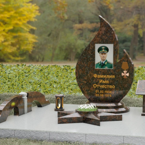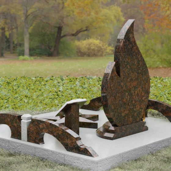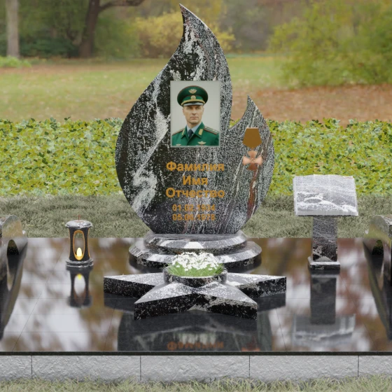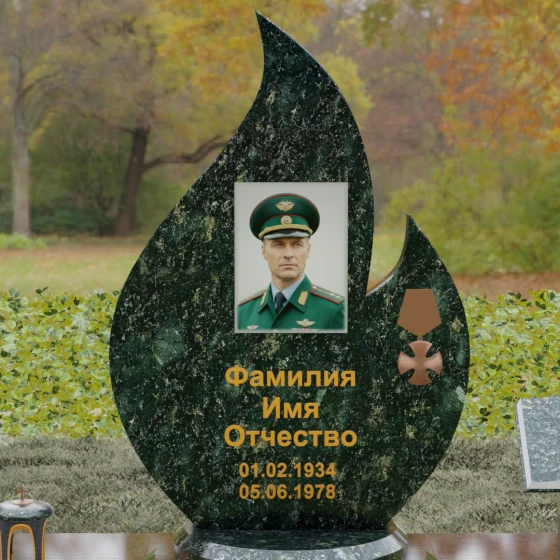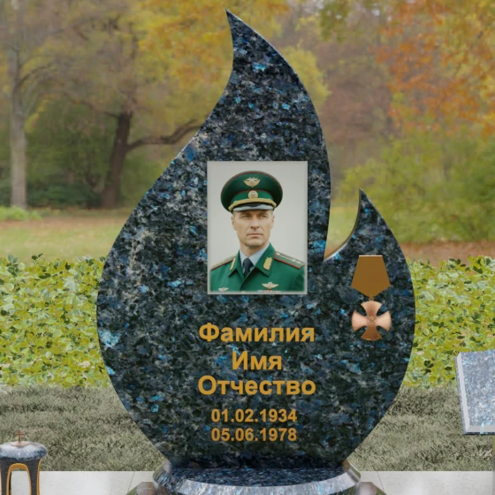 Центральное мемориальное изделие выполнено в уникальной форме застывшего пламени, которое стремится ввысь, символизируя неугасаемую энергию жизни. Плавные, текучие изгибы боковых граней переходят в изящное заостренное навершие, создавая динамичный и одновременно строгий силуэт. Особое внимание стоит уделить обработке камня: по всему периметру лицевой грани снята широкая фаска, которая благодаря безупречной зеркальной полировке создает великолепную игру света и тени, подчеркивая объем и скульптурность формы.