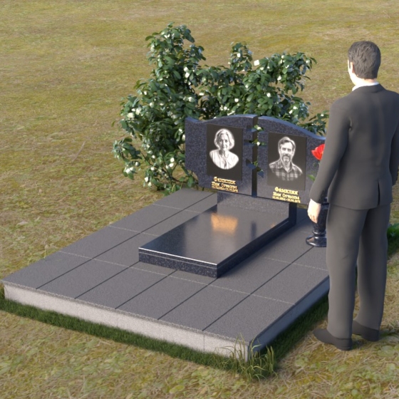 Величественная стела памятника ПГ016 представляет собой композицию из двух вертикальных элементов, объединенных общей идеей и стилем. Каждый элемент имеет свою индивидуальную форму, но вместе они создают гармоничный и целостный образ. Стела выполнена из полированного гранита глубокого черного цвета, который служит идеальным фоном для гравировки портретов и надписей. Контраст между гладкой, зеркальной поверхностью и выгравированными изображениями создает эффект глубины и выразительности. Между двумя стелами прорезана фигура креста, символизирующая веру и духовность. Этот элемент добавляет композиции особое значение и подчеркивает ее сакральный характер. Справа от портрета выгравирована изящная роза, ее лепестки искусно проработаны, создавая ощущение объема и реалистичности. Цветы символизируют любовь, память и скорбь об ушедшем.