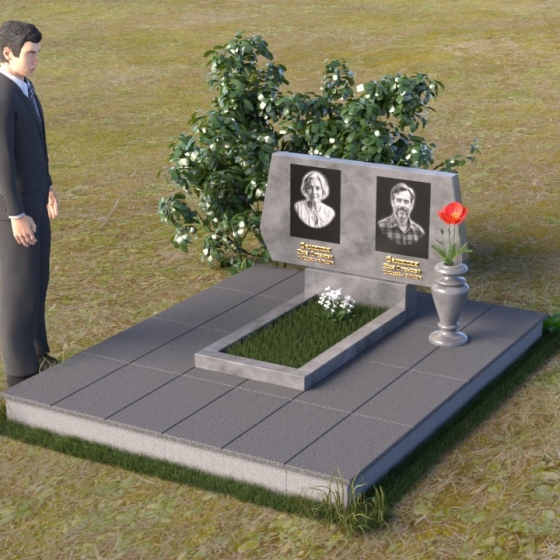 Представляем вам ритуальное изделие – памятник на могилу (Артикул: ПГ018), архитектурное решение, в котором строгость линий сочетается с глубоким символизмом. Это не просто надгробие, а осязаемое воплощение уважения и вечной памяти об ушедшем человеке. Стела, выполненная в форме сдержанного прямоугольника, слегка расширяющегося кверху, символизирует восхождение души к небесам. Грани камня тщательно обработаны, создавая игру света и тени, подчеркивающую монументальность и значимость этого места памяти. Слева и справа, верхние углы стелы имеют элегантные скосы, смягчающие строгость формы и придающие ей утонченность. На зеркальной поверхности камня выгравированы портреты усопших, их имена и даты жизни, выполненные с безупречной точностью и вниманием к деталям. Под портретами располагаются лаконичные надписи, выполненные строгим шрифтом, добавляющие памятнику сдержанности и достоинства. Дополнительная горизонтальная плита, расположенная перед стелой, создает ощущение завершенности и служит местом для возложения цветов или свечей. Этот элемент композиции выполнен в той же стилистике, что и основная стела, поддерживая общую гармонию и пропорциональность мемориального комплекса.