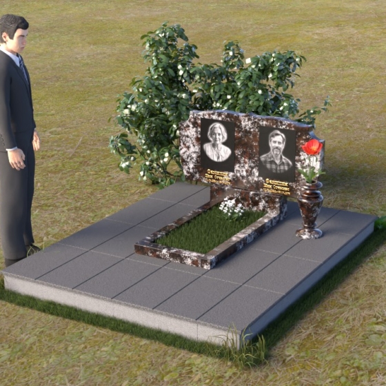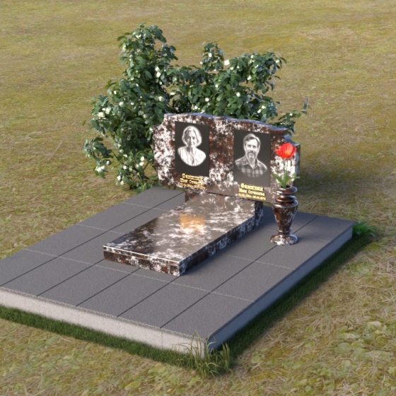 Композиция монумента строится на контрасте плавных линий и строгих геометрических форм. Верхняя часть, несущая на себе портреты усопших, имеет форму, напоминающую раскрытую книгу или свиток, где каждая страница хранит историю жизни. Края этого "свитка" искусно обработаны: верхняя грань словно оплавлена временем, приобретая мягкие, неровные очертания, а боковые стороны имеют более четкий, но все же сглаженный профиль. Фаска, идущая по периметру, придает верхней части визуальную легкость, отделяя ее от основания. Нижняя часть представляет собой прямоугольную плиту с зеркальной полировкой, отражающей небо и окружающий мир, создавая эффект бесконечности и связи с ушедшим. Она словно портал, соединяющий мир живых и мир мертвых, напоминая о непрерывности бытия. Боковины плиты имеют четкую геометрию, подчеркивая основательность и незыблемость памяти.