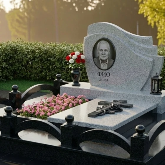 Оформление: Для этой формы стелы, напоминающей свиток, идеально подходит гравировка портрета в овальной или прямоугольной рамке, которая будет гармонично смотреться на фоне плавных изгибов. Рекомендуется использовать классические шрифты для ФИО и дат, чтобы сохранить строгий и достойный вид. Возможно добавление небольших символических элементов, таких как ветви, цветы или религиозные символы, которые будут деликатно вписаны в общую композицию, не нарушая ее гармонии.