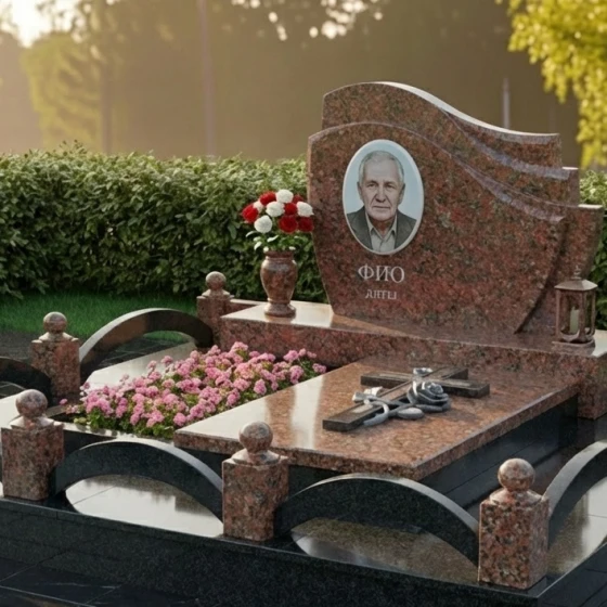 Благоустройство участка продумано до мелочей. Монумент установлен на прочный цоколь из светлого гранита с мелкозернистой структурой. Цоколь имеет среднюю высоту и подчеркивает монументальность композиции. По периметру участка выложены каменные бордюры, формирующие единое пространство. Особенностью является декоративное ограждение из того же светлого гранита, выполненное в виде полукруглых арок, создающих ощущение легкости и воздушности, а также небольших столбиков, завершающих каждый пролет. Внутри этого ограждения, по бокам от надгробной плиты, расположены клумбы, предназначенные для живых цветов, что придает месту ухоженный и живой вид. Надгробная плита, закрывающая все пространство захоронения, создает законченный и аккуратный вид, значительно упрощая уход за местом последнего упокоения. Дополнительные элементы декора включают изящную вазу для цветов и лампаду из черного гранита, которые гармонично дополняют композицию, размещенные на пьедесталах по бокам от стелы.